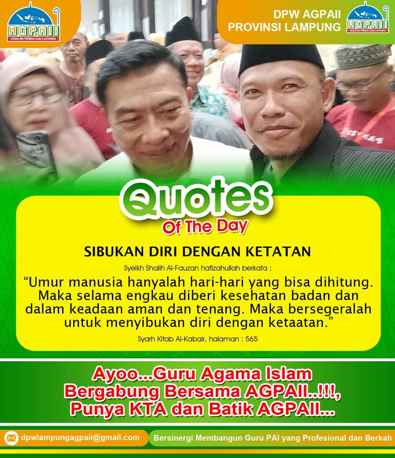 Pernahkah kita merenung sejenak di sela kesibukan mengajar, mendidik, atau mendampingi peserta didik? Seberapa sering kita memikirkan bahwa umur hanyalah kumpulan hari-hari yang bisa dihitung? Hari ini DPW AGPAII Lampung mengajak para guru, khususnya para pendidik agama Islam, untuk menyelami sejenak makna hidup melalui salah satu quotes of the day yang menyentuh dan menggugah hati.